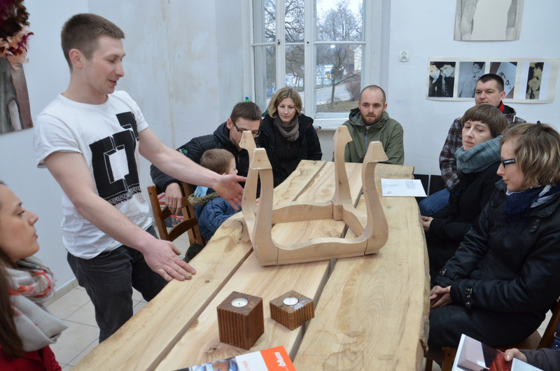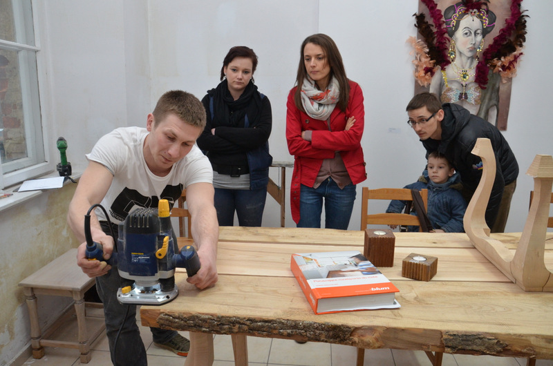 – „Ale fajne!”, „A, czyli tak to działa!” czy „O kurcze” – to tylko kilka komentarzy jakie dało się słyszeć w trakcie pierwszych warsztatów stolarskich, które odbyły się 11.04.2013 w galerii w pałacu. Uczestnicy na własne oczy przekonali się, jak w trzy minuty można złożyć trzymetrowy stół, mieli też okazję trochę pobrudzić się w wiórach powstałych przy frezowaniu krawędzi blatu.