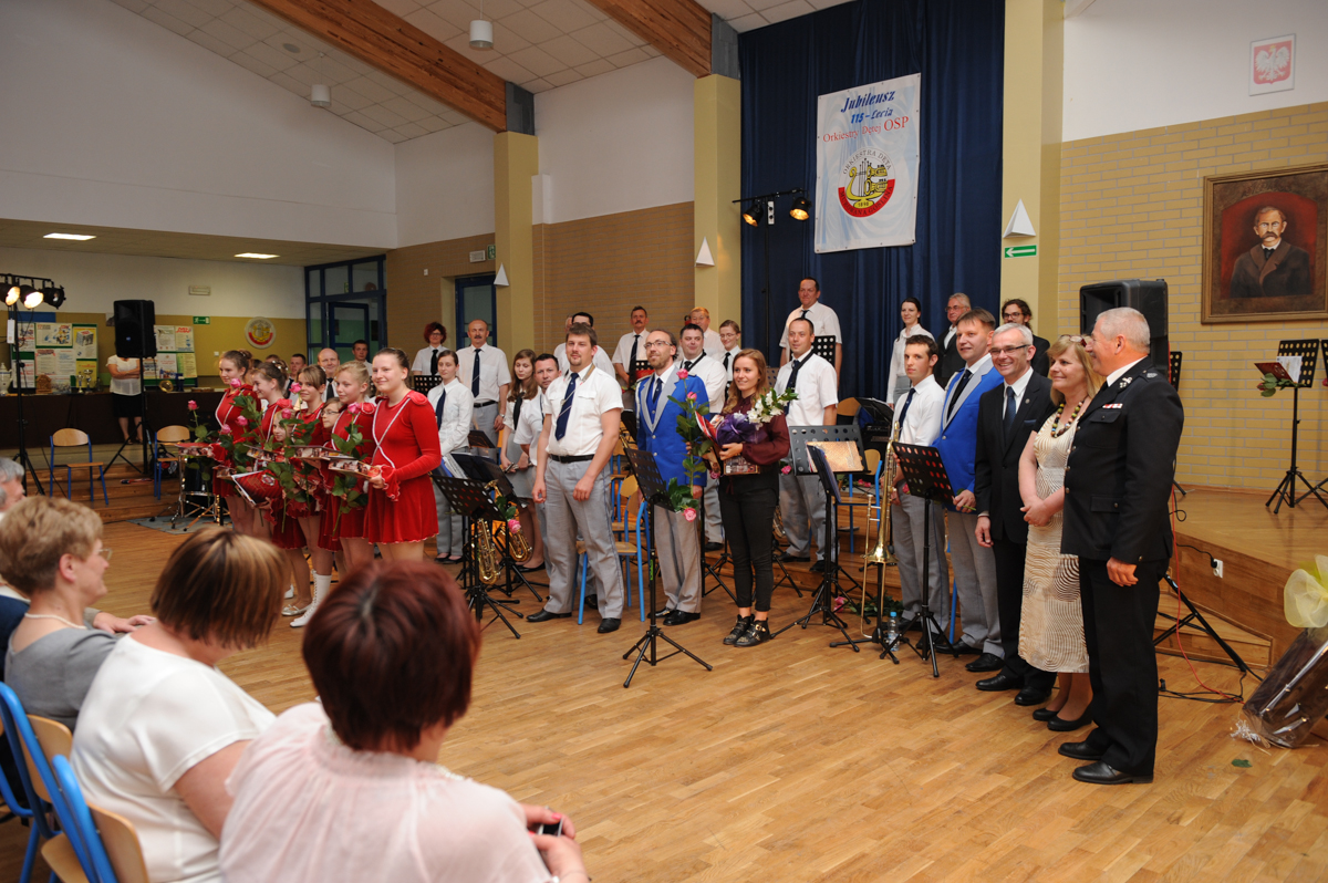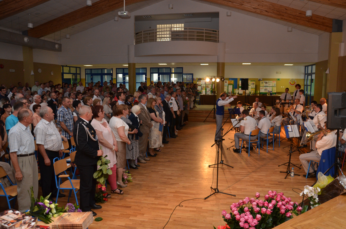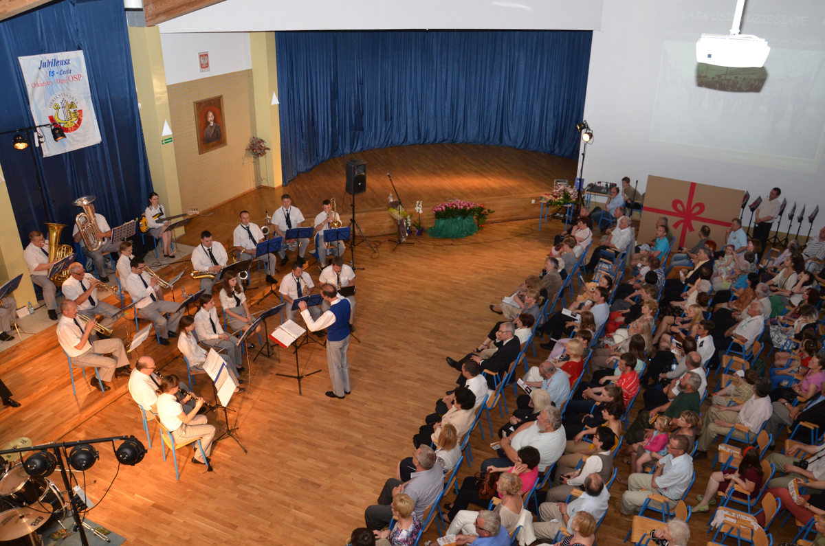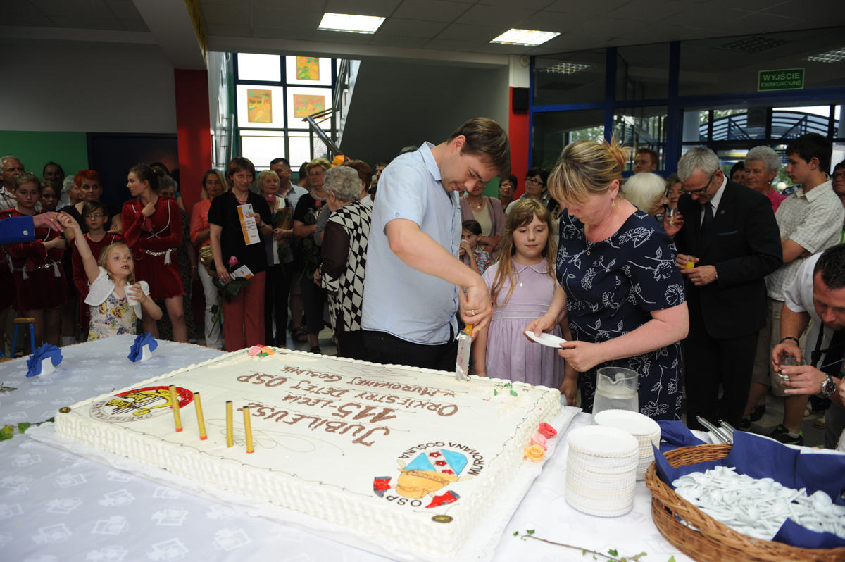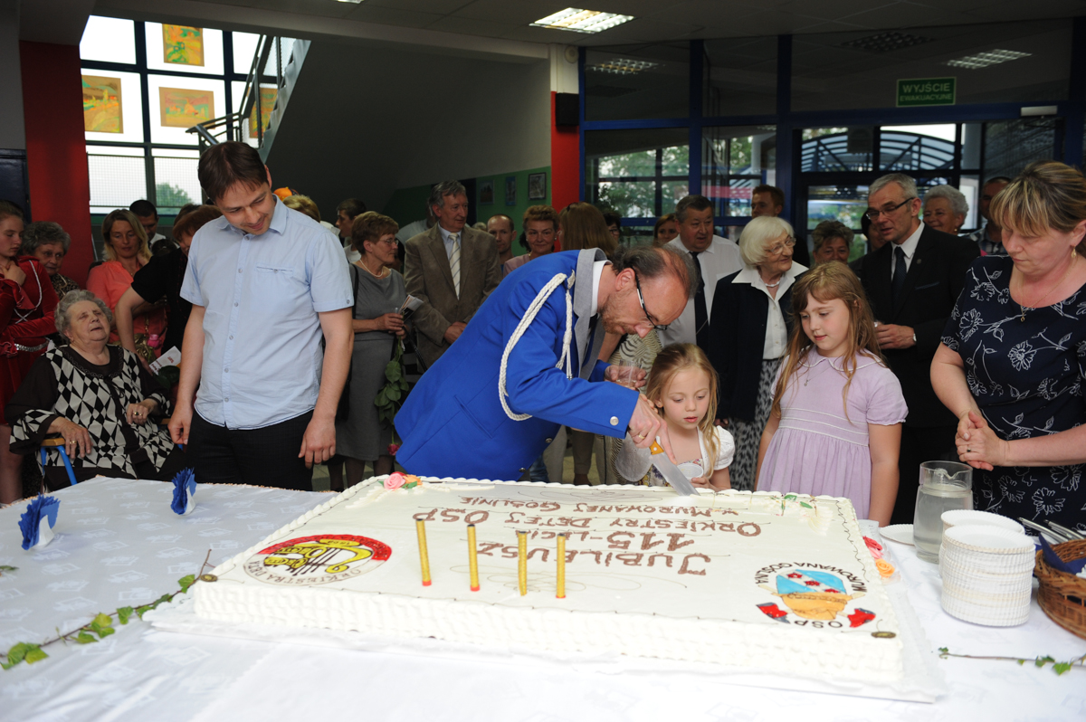 Na stałe współpracuje przy okazji wielu imprez z Miejsko-Gminnym Ośrodkiem Kultury i Rekreacji, pozostając pod jego opieką i skrzydłami. Za to twórcze współistnienie, wszyscy pracownicy Ośrodka Kultury zostali obdarowani przez orkiestrę kwiatami. Uroczystość rozpoczęli: Arleta Włodarczak, Dyrektor MGOKiR i Eugeniusz Tomicki, Prezes OSP witając szanownych jubilatów, zaproszonych gości i licznie zgromadzoną publiczność. Zaproszeni goście i sympatycy orkiestry oraz miłośnicy niepowtarzalnie urokliwego brzmienia instrumentów dętych, wysłuchali koncertu przygotowanego przez zespół jubilatów. Nieżyjących już dyrygentów i członków orkiestry wspomniano i uczczono ich pamięć specjalnym utworem wykonanym na początku koncertu. Wyjątkowymi gośćmi na uroczystości były: Pani Teresa Maligłowska, córka Franciszka Pędzińskiego, drugiego w historii dyrygenta orkiestry (1926 – 1960) i Pani Teresa Majchrzak, żona Benedykta Majchrzaka, trzeciego w historii dyrygenta orkiestry (1960 – 1994). Obie panie otrzymały kwiaty z rąk Prezesa OSP w Murowanej Goślinie Eugeniusza Tomickiego. Wśród gości była także delegacja strażaków z zaprzyjaźnionego Arnum Hemmingen. W programie uroczystości znalazło się wiele atrakcji, przemówienia władz, zaproszonych gości, kwiaty, życzenia, tort i prezenty, oraz to co najpiękniejsze – muzyka. Koncertowy repertuar Orkiestry to m.in. takie utwory, jak dobrze wszystkim znana „Pszczółka Maja”, „Serduszko puka w rytmie cha cha”, kompilacja przebojów zespołu „Abba”. W utworze z serialu „Janosik” Mateusz MJ Sibilski w nietypowej dla dyrygenta konwencji, bardziej przypominając Harnasia w czapce zbójnickiej, miast batuty rombanicą „swoimi zbójnikami” dyrygował. Całość poprowadził brawurowo Marcin Matuszewski, który świetnie utrzymywał dowcipny dyskurs sceniczny z Mateuszem MJ Sibilskim, dyrygentem Orkiestry OSP w Murowanej Goślinie. Spontanicznie pojawił się motyw spotkania, w różnych wątkach pojawiało się hasło PREZES. Specjalną niespodziankę przygotowały panie z zespołu „Goślińskie Chabry”. Wykonały na scenie na cześć muzyków z Orkiestry Dętej, utwór „Pije Kuba do Jakuba”, wzbogacony o użycie należytych rekwizytów z zawartością. Publiczność mogła zobaczyć przygotowaną na tę okazję przez członków orkiestry wystawę pamiątek z lat jej działalności na terenie naszego miasta, kraju i zagranicy, oraz zapoznać się z historią Orkiestry Dętej OSP w Murowanej Goślinie przedstawioną w prezentacji fotograficznej, przygotowanej przez Tomasza Mizgiera i okolicznościowym folderze, przygotowanym przez Arletę Włodarczak. Dęciaki otrzymali w prezencie pulpity nutowe, pamiątkowe dyplomy i kwiaty, które wręczali: Burmistrz Miasta i Gminy Murowana Goślina Tomasz Łęcki, Kierownik Domu Kultury Tomasz Mizgier, Prezes OSP w Murowanej Goślinie Eugeniusz Tomicki. Orkiestra Dęta OSP ma również swój Zespół Taneczny, którego występu nie mogło zabraknąć. Dziewczyny pod kierunkiem instruktor Marty Jankowskiej uświetniły obchody jubileuszu. Na uroczystości stawili się licznie dawni członkowie orkiestrowej rodziny (wśród nich prof. Elżbieta Wtorkowska), jej dyrygenci i instruktorzy: Przemysław Neumann, Iwona Neumann, Krzysztof Warguła, Małgorzata Lang, Grażyna Tomicka. Wszystkim im Prezes Eugeniusz Tomicki, Kapelmistrz Mateusz Sibilski i Prezes Orkiestry Zachariasz Maćkowiak wręczyli okolicznościowe dyplomy i kwiaty. Po części koncertowej jubilaci i zaproszeni goście udali się na toast i duży kawałek pysznego tortu, aby świętować w gronie najbliższych i sympatyków. W kuluarach wspominano wesołe i wzruszające chwile z tego pięknego czasu spędzonego w zespole. To już nie wróci, ale jest co wspominać, cieszyć się i świętować. Czas tak szybko upływa, a ludzie odchodzą, ale zostanie muzyka. Za dziesiątki lat następnym pokoleniom przyjdzie świętować i uczcić pamięć naszych czasów. Z ogromnym zaangażowaniem orkiestrze odśpiewano „Dwieście lat” i zabawa trwała do późnych godzin nocnych.