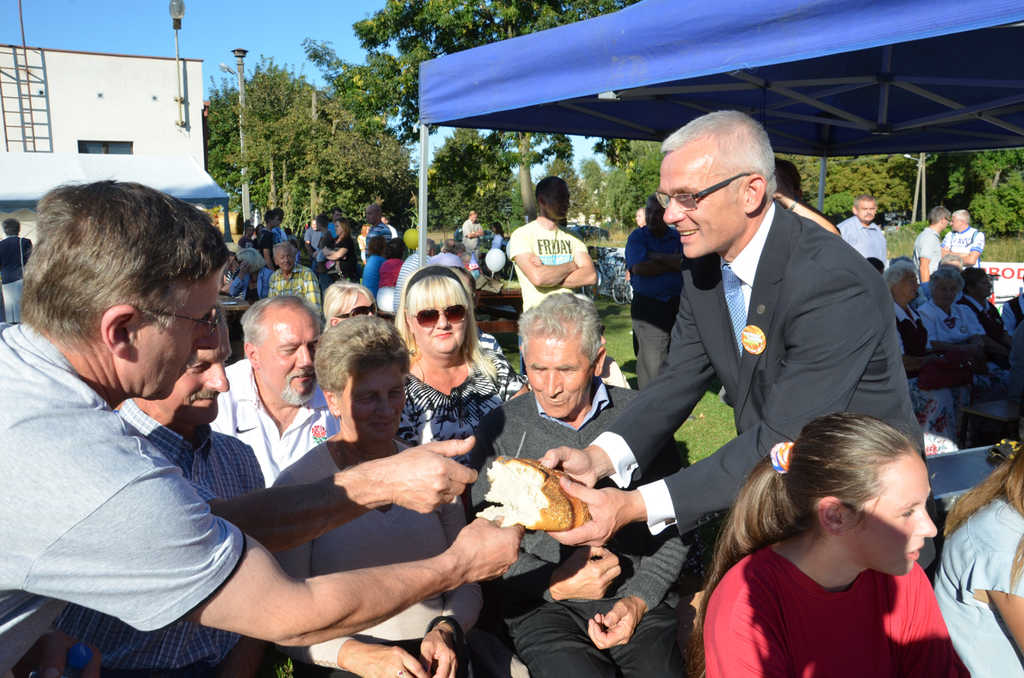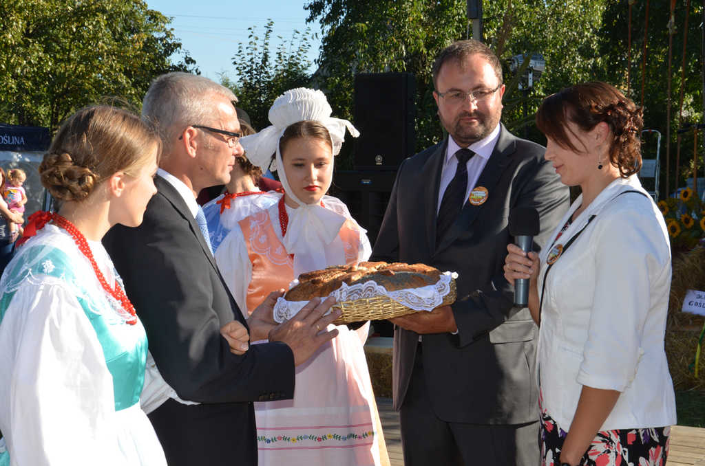 Burmistrz Tomasz Łęcki wraz z Sołtys Białężyna Dorotą Michałowską oraz ze starostami dożynek: Martą Chwał i Mikołajem Marczakiem podzielili się tradycyjnym bochnem chleba z uczestnikami dożynek.