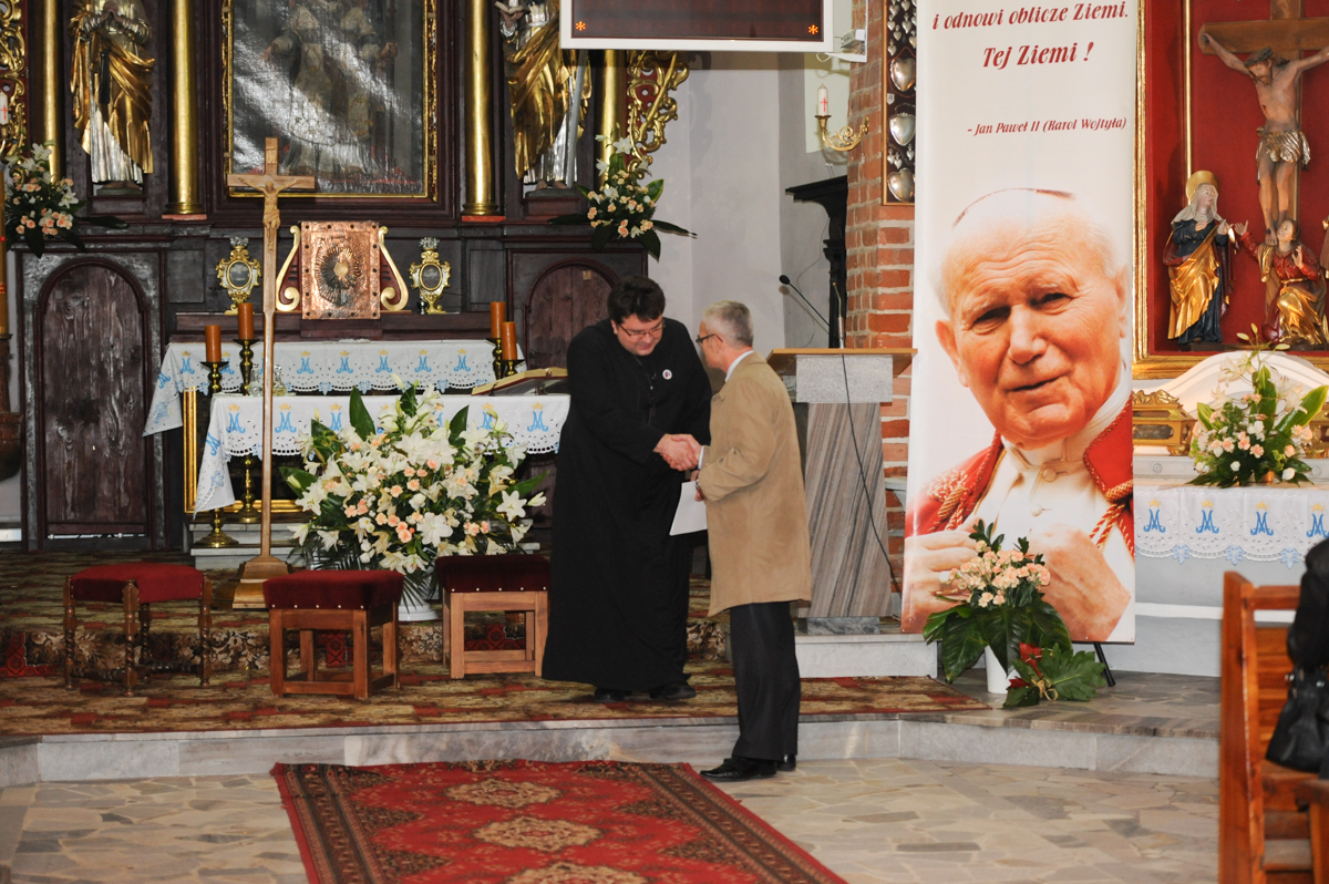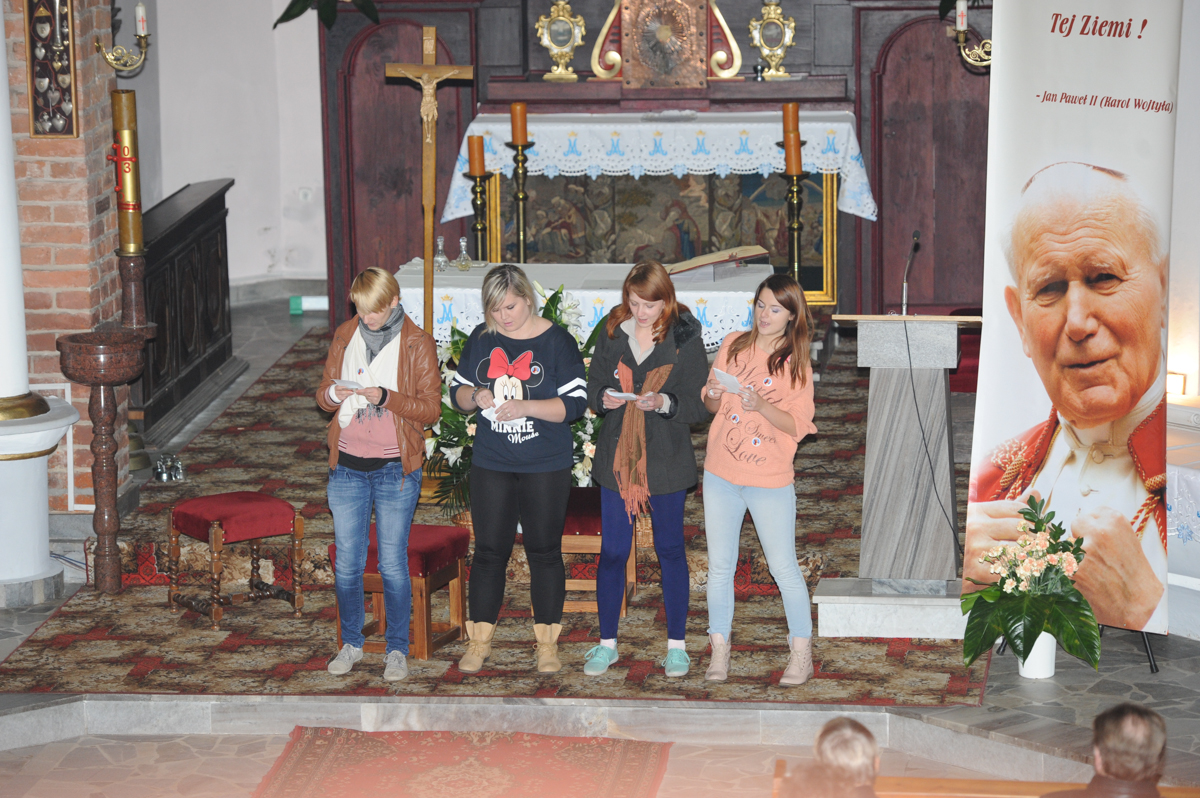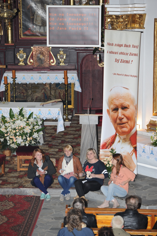 Po mszy św. młodzież z Zespołu Szkół im. Dezyderego Chłapowskiego w Bolechowie, Filia w Murowanej Goślinie zaprezentowała wieczornicę poświęconą osobie Jana Pawła II. Wysłuchaliśmy ważnych słów Papieża wypowiedzianych podczas Jego pontyfikatu. Mieliśmy okazję wspólnie zaśpiewać Jego ulubione pieśni, oddając w ten sposób cześć Wielkiemu Człowiekowi – Słudze Bożemu. Atmosfera podczas wieczornicy była podniosła, wzruszająca, a zarazem radosna. Po raz kolejny mogliśmy bowiem ujrzeć postać Jana Pawła II oraz usłyszeć Jego głos zarejestrowany na taśmie. Ostatnim akcentem uroczystości było odśpiewanie Apelu Jasnogórskiego. Na zakończenie Burmistrz Miasta i Gminy Murowana Goślina Tomasz Łęcki podziękował ks. proboszczowi Ludwikowi Dudzie, ks. Mariuszowi Koronowskiemu, który czuwał nad całością przygotowanej wieczornicy i oczywiście młodzieży występującej tego dnia w kościele.