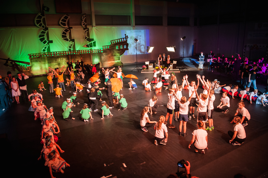 W dniu 11 i 12 października 2014 r. mogliśmy oglądać w hali widowiskowo – sportowej przy ul. Mściszewskiej wielkie widowisko muzyczne pt. „Zatrzymane w kadrze”, czyli dzieje muzyki filmowej. Na dwa dni przestrzeń boisk sportowych zamieniła się w jedną z największych scen teatralnych w Polsce. Organizatorami widowiska byli Miejsko–Gminny Ośrodek Kultury i Rekreacji w Murowanej Goślinie, Pro Sinfonika – Koło Młodych Melomanów Klasa Muzyczna przy Szkole Podstawowej nr 2 im. Henryka Sienkiewicza i Gimnazjum nr 2 im. Jana Kochanowskiego w Murowanej Goślinie. Artyści uraczyli publiczność spektaklem pełnym emocji, wrażeń wizualnych i dźwiękowych na najwyższym artystycznym poziomie. Całość działa się w studio telewizyjnym z udziałem znanych postaci z programów o kinie Grażyny Torbickiej i Zygmunta Kałużyńskiego, do którego zaproszeni zostali uczniowie ze szkoły. W tym momencie zaczęła się wyliczanka najwspanialszych dzieł muzycznych filmu. Aktorzy zwizualizowali układami tanecznymi, występami wokalnymi i instrumentalnymi historię muzyki filmowej od początków kina do współczesności. Wystąpiły zespoły taneczne , tancerze solowi, chóry, soliści , orkiestra , soliści instrumentaliści. Ich role w spektaklu nie ograniczały się tylko do wykonania swojego utworu. Wszystko wspaniale przeplatało się ze sobą, gra aktorska we wspaniale przygotowanych kostiumach z wykorzystaniem rekwizytów z tańcem i partiami wokalno aktorskimi. Tak zbudowany spektakl przez niemal dwie godziny uwodził publiczność tą niezwykłą magią jaką czaruje nas kino. Znaleźliśmy się w centrum planu filmowego, jakby po drugiej stronie celuloidowej taśmy. Mogliśmy zobaczyć na żywo spacerujących po pokładzie pasażerów Titanica, zobaczyć upiora w operze czy zagubić się w oczarowaniu razem z Alicją w krainie czarów i przeżyć wiele innych cudownych momentów z dobrze nam znanych filmów.