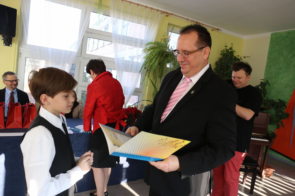 Druga część konkursu rozpoczęła się od wręczenia przez pana Burmistrza Dariusza Urbańskiego dyplomów i upominków wszystkim artystom. Następnie Pan Burmistrz pogratulował pianistom wysokich umiejętności, zwrócił uwagę, że na sukces składają się talenty, szczęście, ale przede wszystkim ciężka praca. Później przewodniczący jury – dr. hab. Piotr Niewiedział w kilku słowach pochwalił wszystkie prezentacje i ogłosił werdykt.