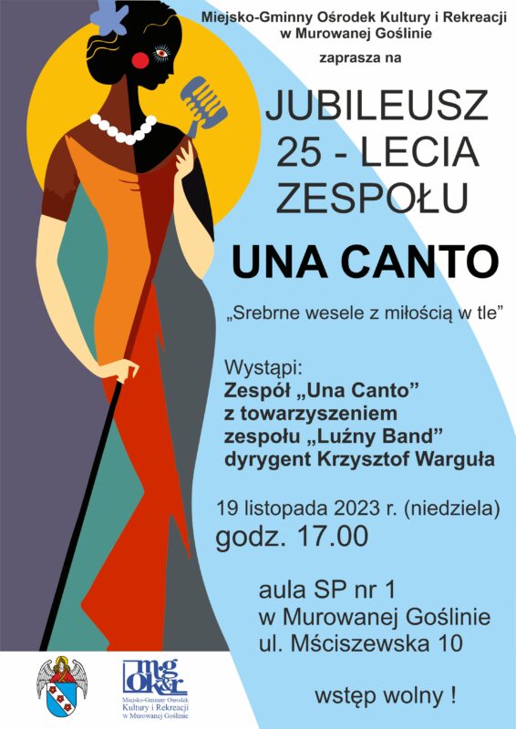 Plakat informacyjny z ilustracją śpiewaczki na scenie z mikrofonem o treści: Miejsko-Gminny Ośrodek Kultury i Rekreacji w Murowanej Goślinie zaprasza na jubileusz 25-lecia zespołu Una Canto „Srebrne Wesele z miłością w tle”. Wystąpi: Zespół „Una Canto” z towarzyszeniem zespołu „Luźny Band” dyrygent Krzysztof Warguła. 19 listopada 2023 r. (niedziela), godz. 17.00 aula SP nr 1 w Murowanej Goślinie przy ul. Mściszewskiej 10. Wstęp wolny.
