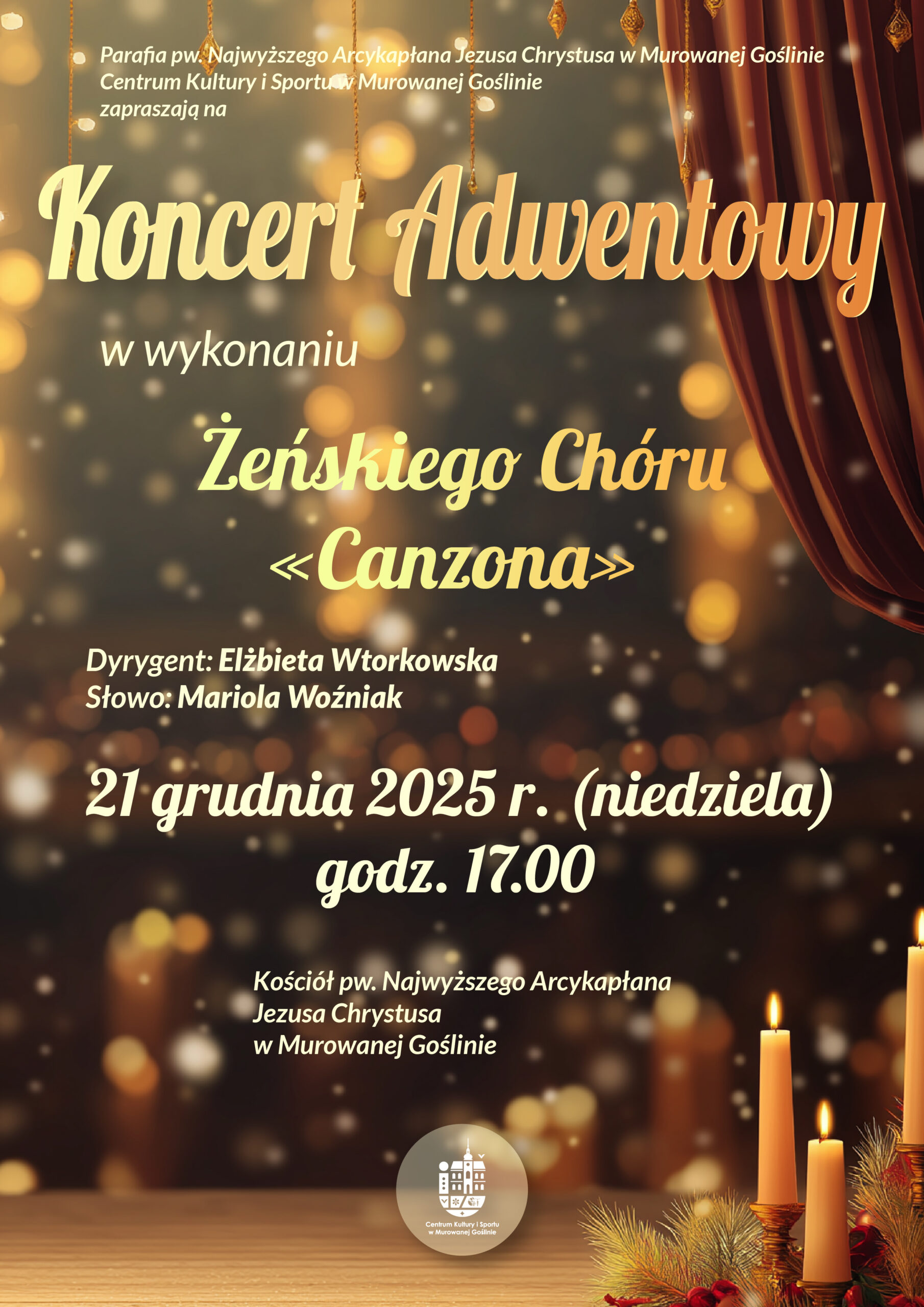 Plakat informujący o Koncercie Adwentowym o treści: Parafia pw. Najwyższego Arcykapłana Jezusa Chrystusa w Murowanej Goślinie Centrum Kultury i Sportu w Murowanej Goślinie zapraszają na Koncert Adwentowy w wykonaniu Żeńskiego Chóru Canzona Dyrygent: Elżbieta Wtorkowska Słowo: Mariola Woźniak 21 grudnia 2025 r. (niedziela), godz. 17.00 Kościół pw. Najwyższego Arcykapłana Jezusa Chrystusa w Murowanej Goślinie. Tło w ciepłych, złotych barwach z rozmytymi światełkami oraz świecami na dole. Po prawej stronie widoczne są bordowe kotary sceniczne