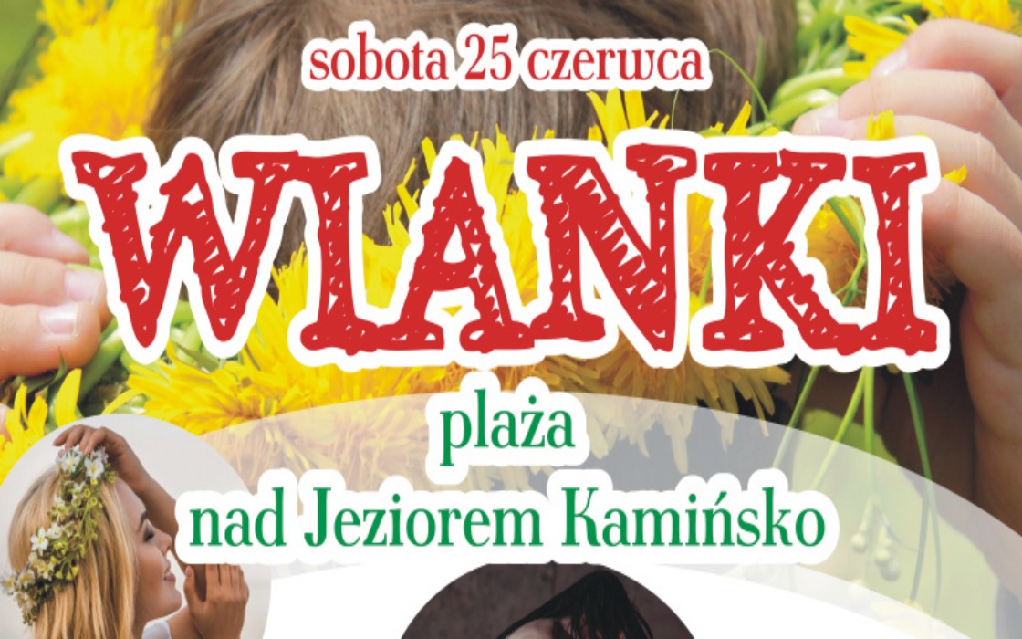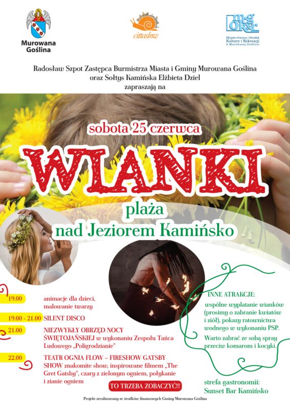Plakat informacyjny u góry herb gminy Murowana Goślina, logo Cittaslow, logo ośrodka kultury, o treści: Radosław Szpot Zastępca Burmistrza Miasta i Gminy Murowana Goślina oraz Sołtys Sołectwa Kamińsko Elżbieta Dziel zapraszają na sobota 25 czerwca wianki plaża nad Jeziorem Kamińsko. 19.00 – 21.00 SILENT DISCO, 21.00 NIEZWYKŁY OBRZĘD NOCY ŚWIĘTOJAŃSKIEJ w wykonaniu Zespołu Tańca Ludowego „Poligrodzianie”, 22.00 TEATR OGNIA FLOW – FIRESHOW GATSBY SHOW znakomite show, inspirowane filmem „The Gret Gatsby”, czary z zielonym ogniem, połykanie i zianie ogniem TO TRZEBA ZOBACZYĆ!!!, Inne atrakcje: wspólne wyplatanie wianków (prosimy o zabranie kwiatów i ziół), malowanie twarzy i animacje dla dzieci, pokazy ratownictwa wodnego w wykonaniu PSP, strefa gastronomii Sunset Bar Kamińsko. Warto zabrać ze sobą spray przeciw komarom i kocyki. Projekt zrealizowany ze środków finansowych gminy Murowana Goślina. Plakat zawiera motywy graficzne: dziewczyna w wianku na włosach, mężczyzna tańczący z ogniem