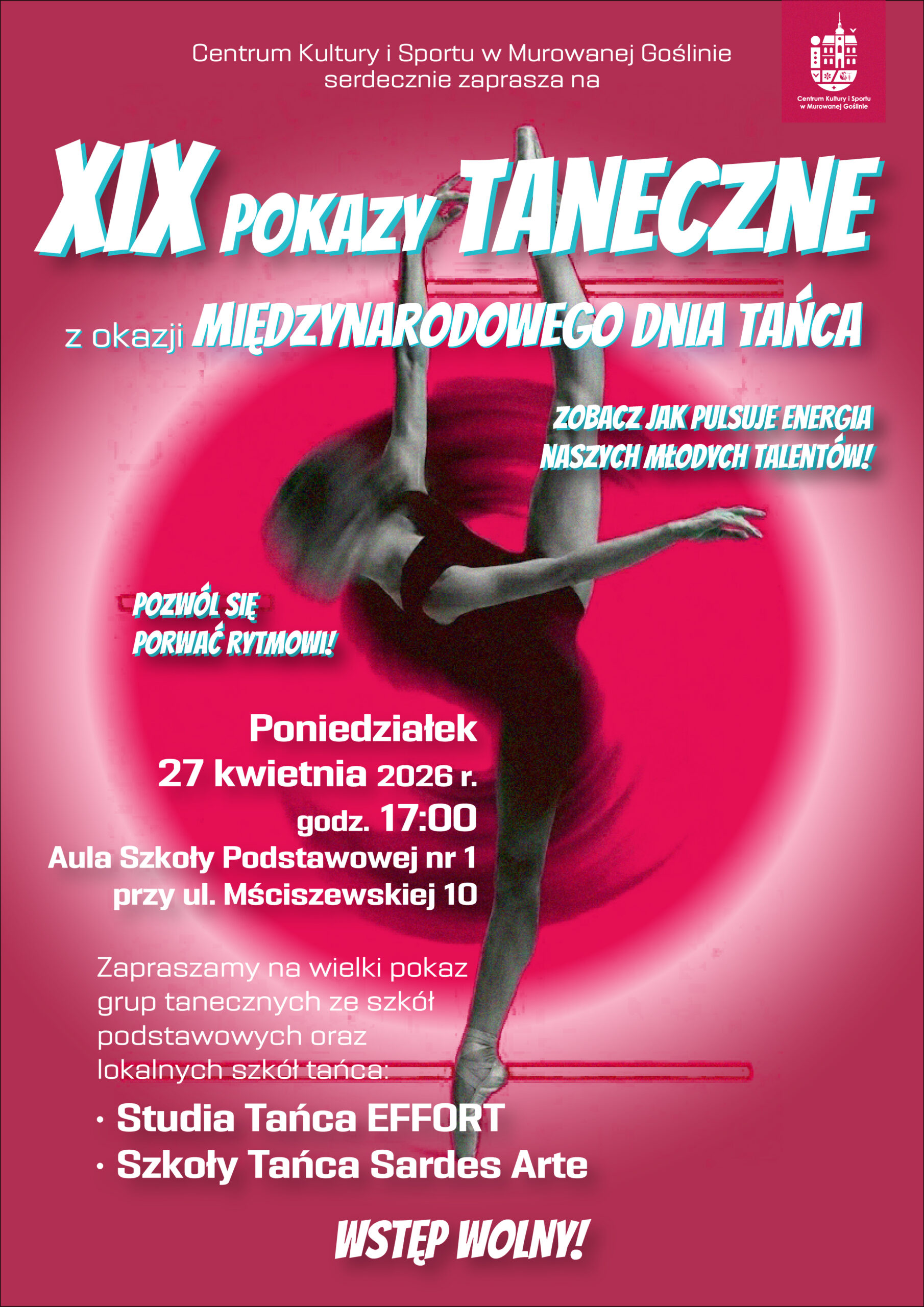 z okazji Międzynarodowego Dnia TańcaWystąpią grupy taneczne ze szkół podstawowych,  Studia Tańca EFFORT, Szkoły Tańca Sardes Arte.Poniedziałek 27 kwietnia 2026 r.,godz.17.00