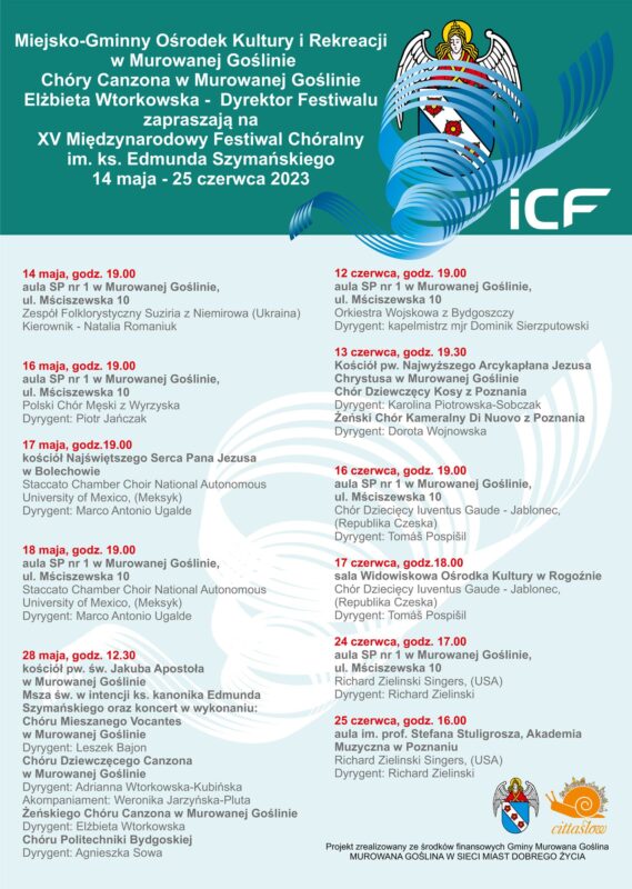 Plakat informacyjny z logo festiwalu chóralnego z herbem miasta na wirującej pięciolinii o treści: Miejsko-Gminny Ośrodek Kultury i Rekreacji w Murowanej Goślinie Chóry „Canzona” w Murowanej Goślinie, Elżbieta Wtorkowska – Dyrektor Festiwalu zapraszają na XV Międzynarodowy Festiwal Chóralny im. ks. Edmunda Szymańskiego 14 maja – 25 czerwca 2023. 14 maja, godz. 19.00 aula SP nr 1 w Murowanej Goślinie,ul.Mściszewska 10 Zespół Folklorystyczny Suziria z Niemirowa (Ukraina) Kierownik – Natalia Romaniuk.16 maja, godz. 19.00 aula SP nr 1 w Murowanej Goślinie, ul. Mściszewska 10. Polski Chór Męski z Wyrzyska Dyrygent: Piotr Jańczak.17 maja, godz.19.00 kościół Najświętszego Serca Pana Jezusa w Bolechowie National Autonomous University of Mexico’s Chamber Choir Stacatto, (Meksyk) Dyrygent: Marco Antonio Ugalde.18 maja, godz. 19.00 aula SP nr 1 w Murowanej Goślinie, ul. Mściszewska 10 National Autonomous University of Mexico’s Chamber Choir Stacatto, (Meksyk) Dyrygent: Marco Antonio Ugalde. 28 maja, godz. 12.30 kościół pw. św. Jakuba Apostoła w Murowanej Goślinie Msza św. w intencji ks. kanonika Edmunda Szymańskiego oraz koncert w wykonaniu: Chóru Mieszanego „Vocantes” w Murowanej Goślinie Dyrygent: Leszek Bajon, Chóru Dziewczęcego „Canzona” w Murowanej Goślinie Dyrygent: Adrianna Wtorkowska – Kubińska Akompaniament: Weronika Jarzyńska-Pluta, Chóru Żeńskiego „Canzona” w Murowanej Goślinie Dyrygent: Elżbieta Wtorkowska, Chóru Politechniki Bydgoskiej